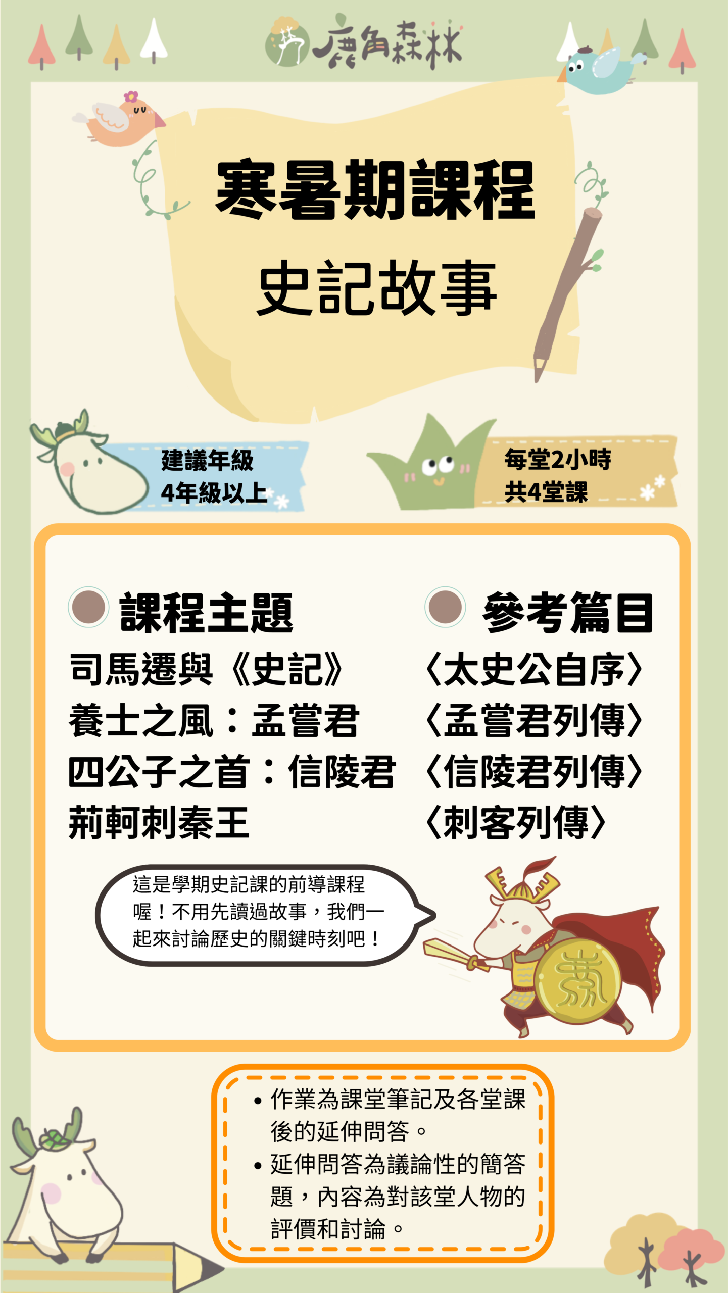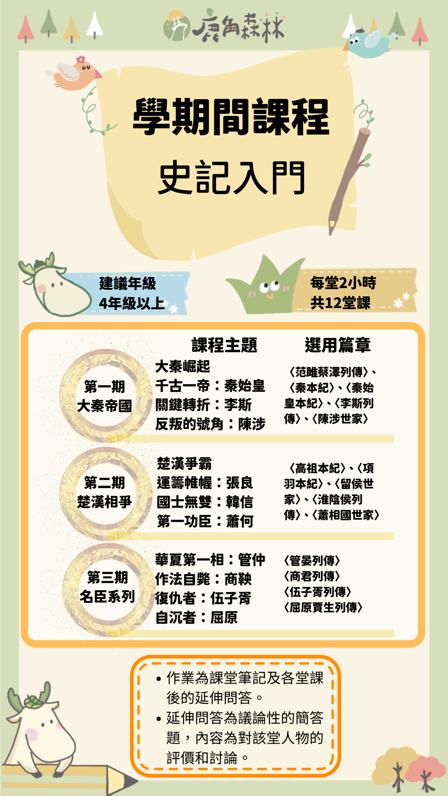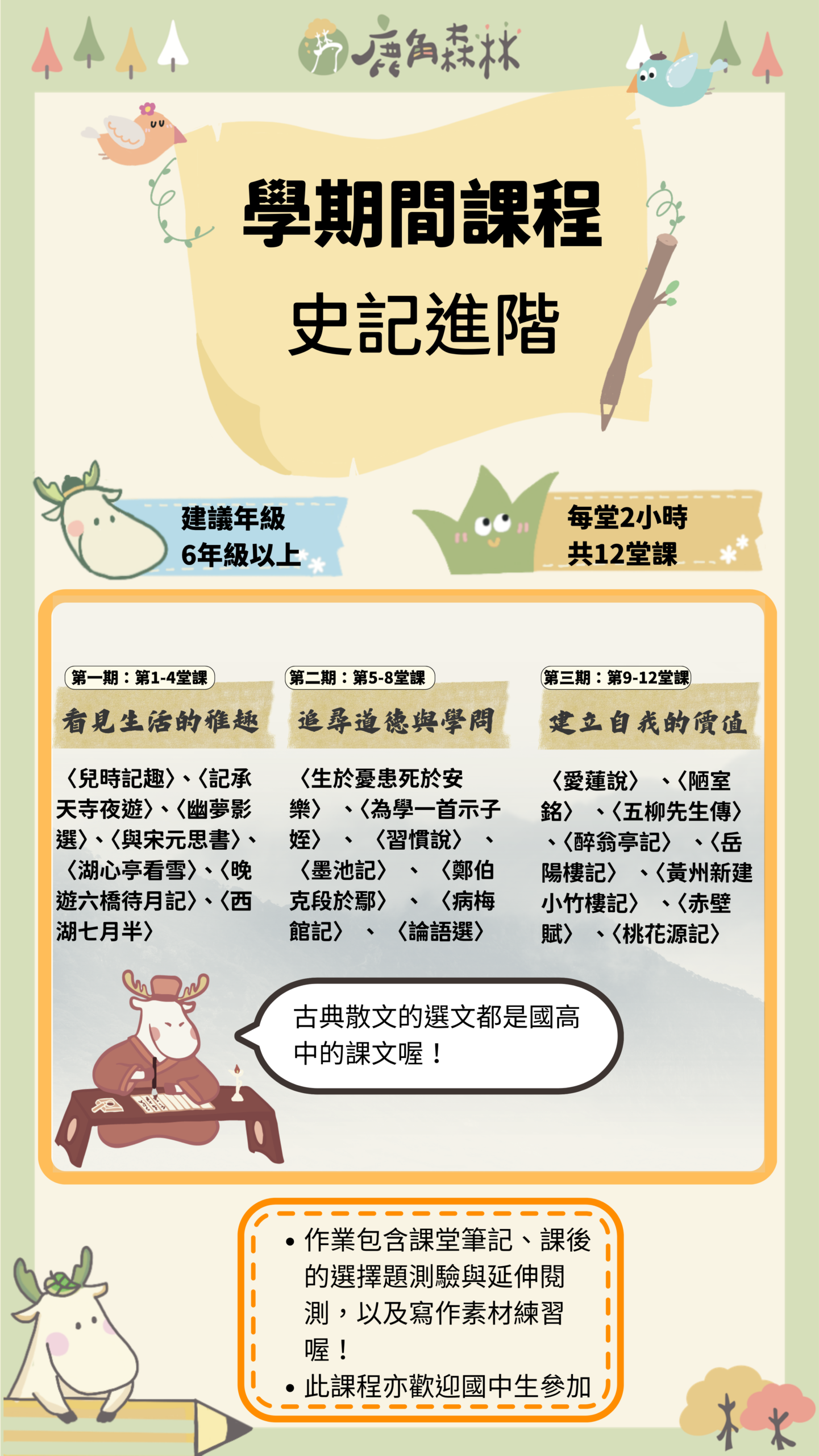 鹿角森林的國學類課程,不是要孩子提早背誦艱深古文,而是帶他們從有趣的文本與人物故事出發,慢慢建立理解古典的能力。我們會從唐詩、史記、世說新語、古典散文到文學史,陪孩子認識不同時代的生命情境、語言風格與思想世界。課程重點不只在知識記憶,更在於培養閱讀理解、歷史感、思辨能力與表達能力。希望孩子在經典中看見人性,也在一次次討論與書寫裡,慢慢長出屬於自己的眼光。