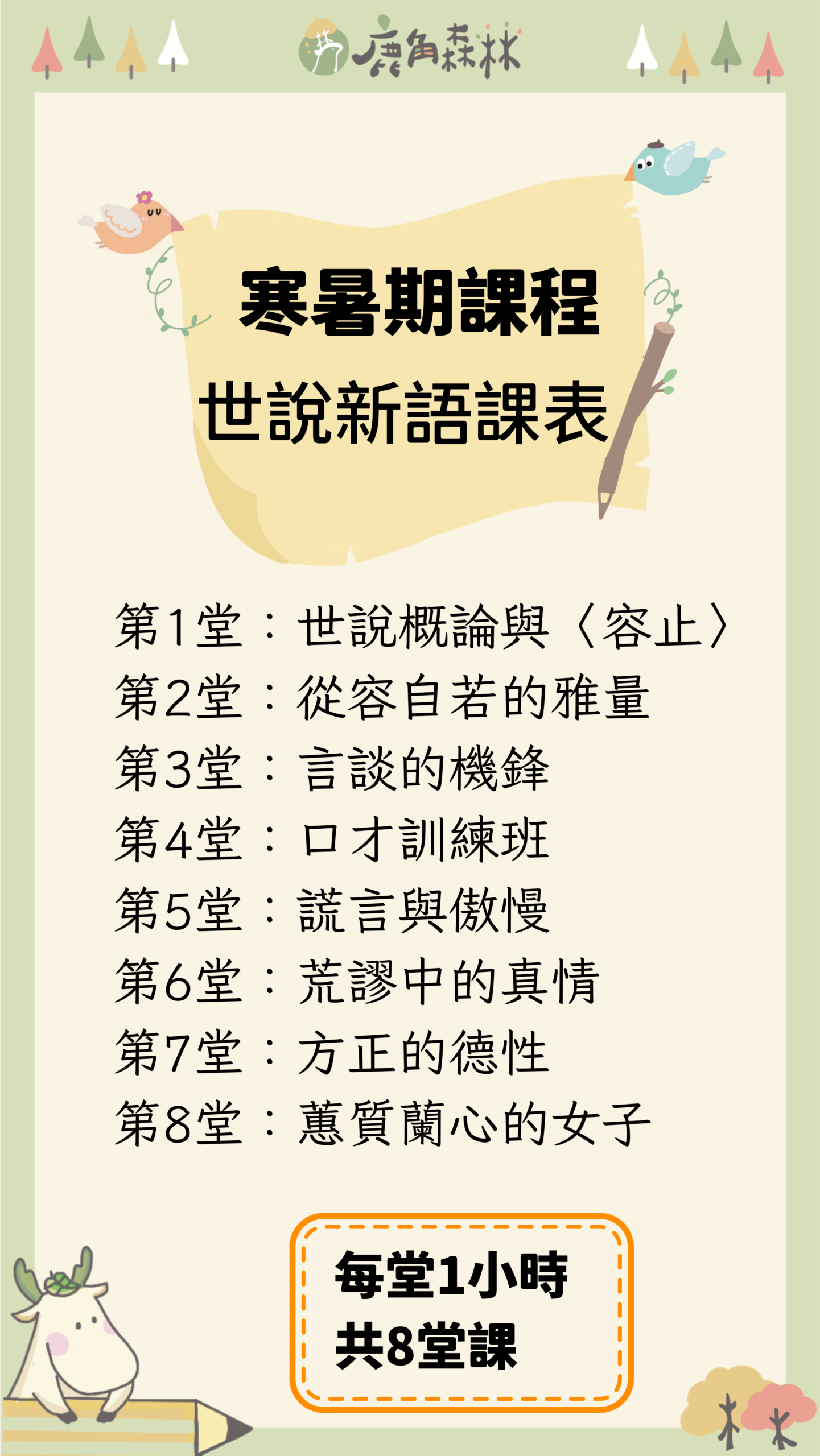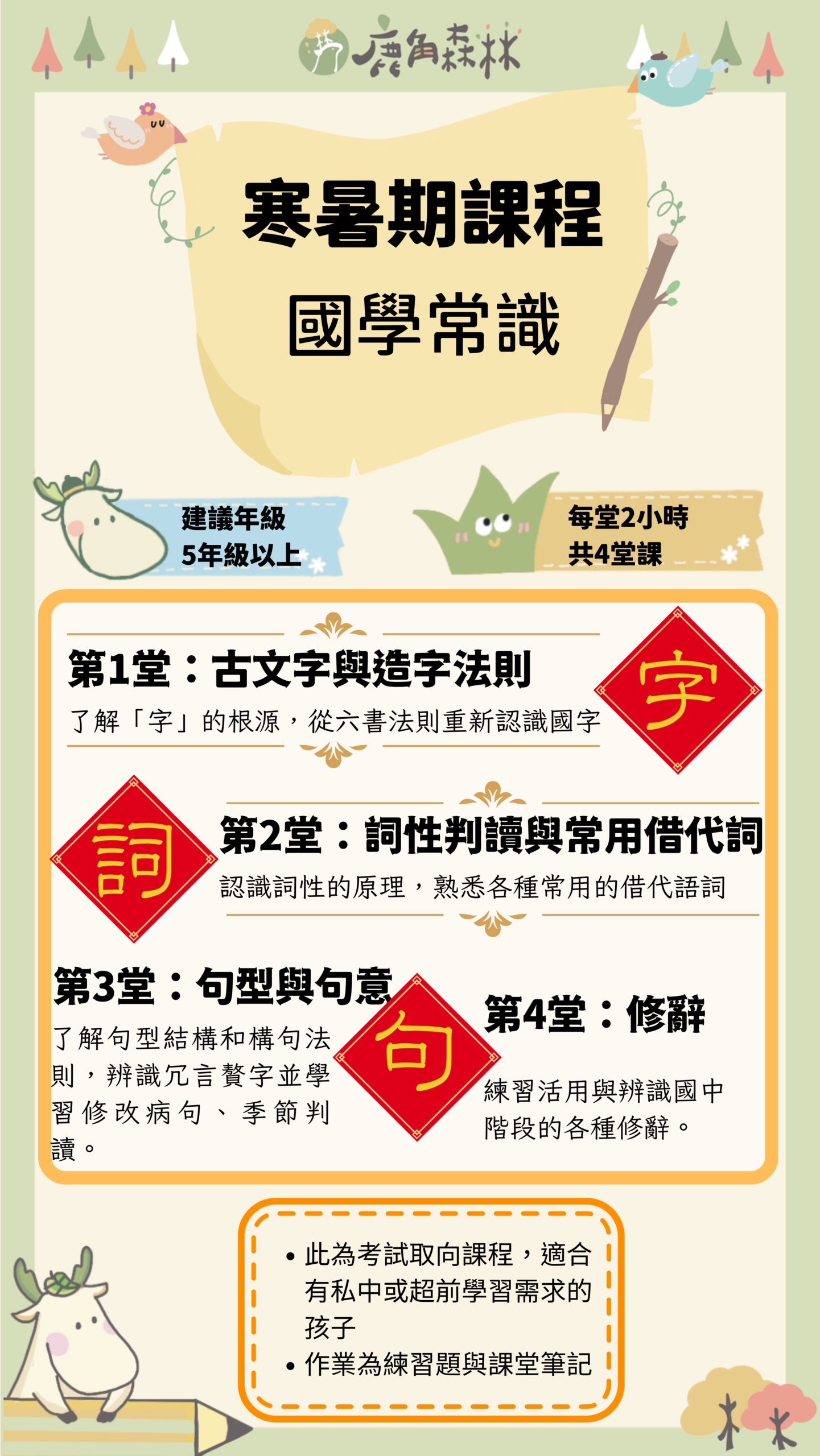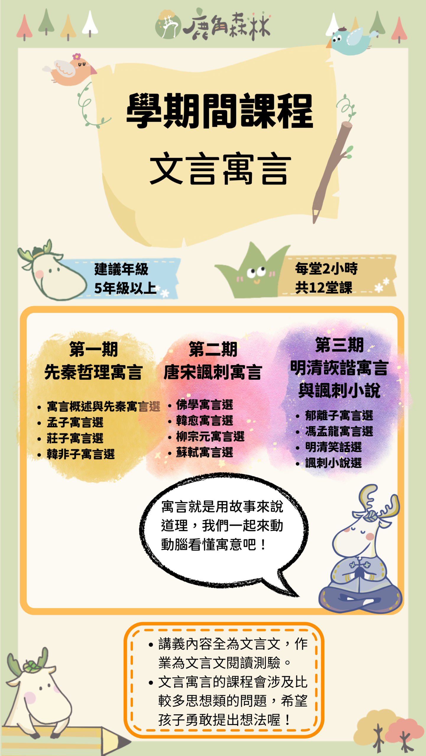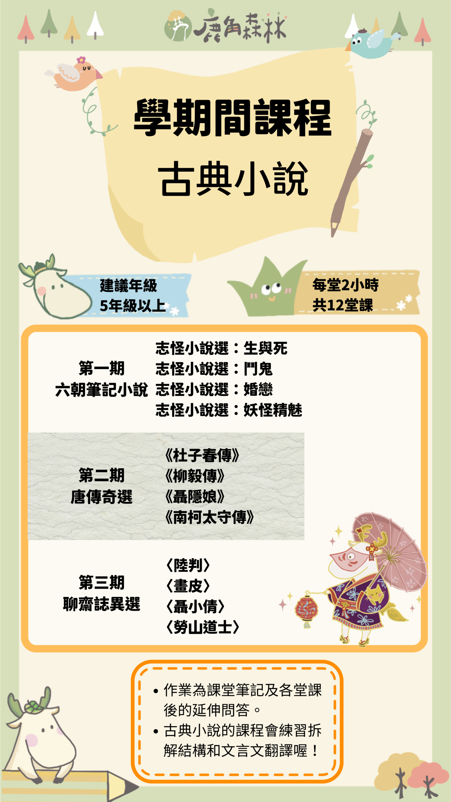 鹿角森林的國學類課程,不是要孩子提早背誦艱深古文,而是帶他們從有趣的文本與人物故事出發,慢慢建立理解古典的能力。我們會從唐詩、史記、世說新語、古典散文到文學史,陪孩子認識不同時代的生命情境、語言風格與思想世界。課程重點不只在知識記憶,更在於培養閱讀理解、歷史感、思辨能力與表達能力。希望孩子在經典中看見人性,也在一次次討論與書寫裡,慢慢長出屬於自己的眼光。