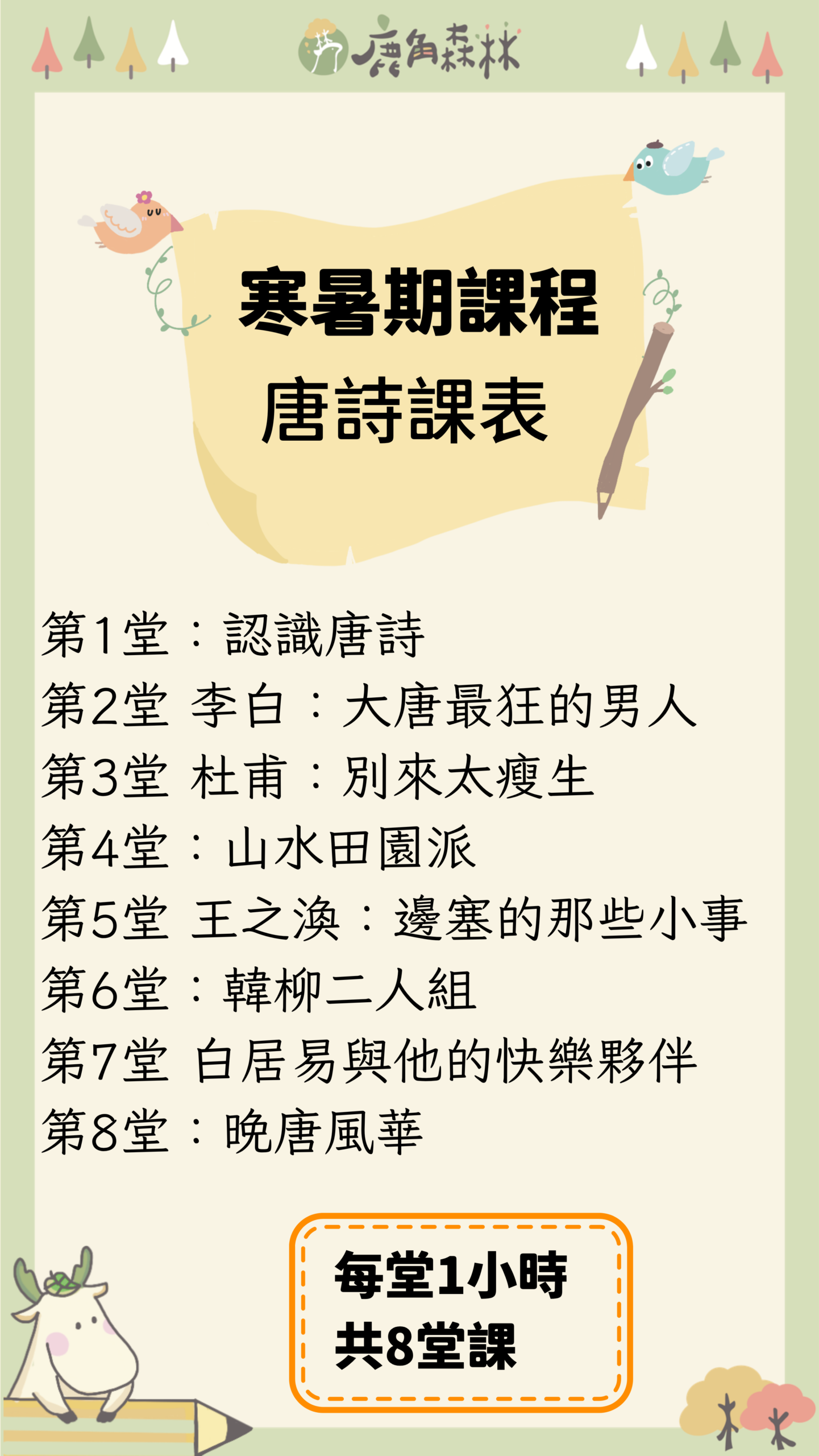 鹿角森林的唐詩課程,以八堂課帶孩子走進詩的格律與情感。從韻文結構與近體詩的規則出發,深入認識李白的豪放、杜甫的沉鬱、山水田園的清雅與晚唐詩人的細膩幽微。透過趣味講述與角色切入,孩子不只讀詩,也理解詩人如何在字裡行間說人生的選擇與困境,建立詩感,更練習思辨與閱讀判斷的能力。